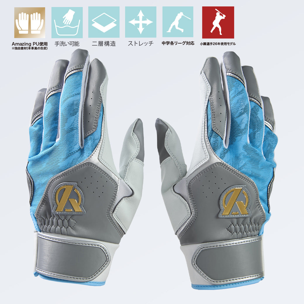― 本革風味 × 高耐久 × 洗える ― 2026年モデル最大の進化点が、新素材「Amazing PU」の採用。 合皮でありながら、本革のような質感とハリ、高級感を併せ持つ素材に仕上げた。しっかりとした作りでありながら耐久性が高く、汗や雨で汚れても洗えるため、日々の練習から試合まで気兼ねなく使用できる。 「本革の使用感が欲しい。でも洗うことができない。」 そんな現場のリアルな声に応える形で誕生したAmazing PUは、合皮素材の手袋の常識を覆し、選ばれる理由のある合皮として完成した。